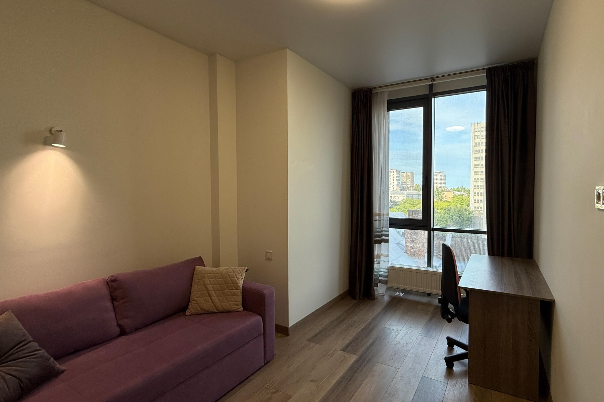 Квартира розташована на 7-му поверсі, вікнами на схід, у бік моря. Планування зручне та продумане: - Спальня і кабінет з панорамними вікнами у підлогу; - Кухня-вітальня площею 18 м² з другим світлом; - Санвузол з душовою кабіною; - Простора гардеробна у передпокої.